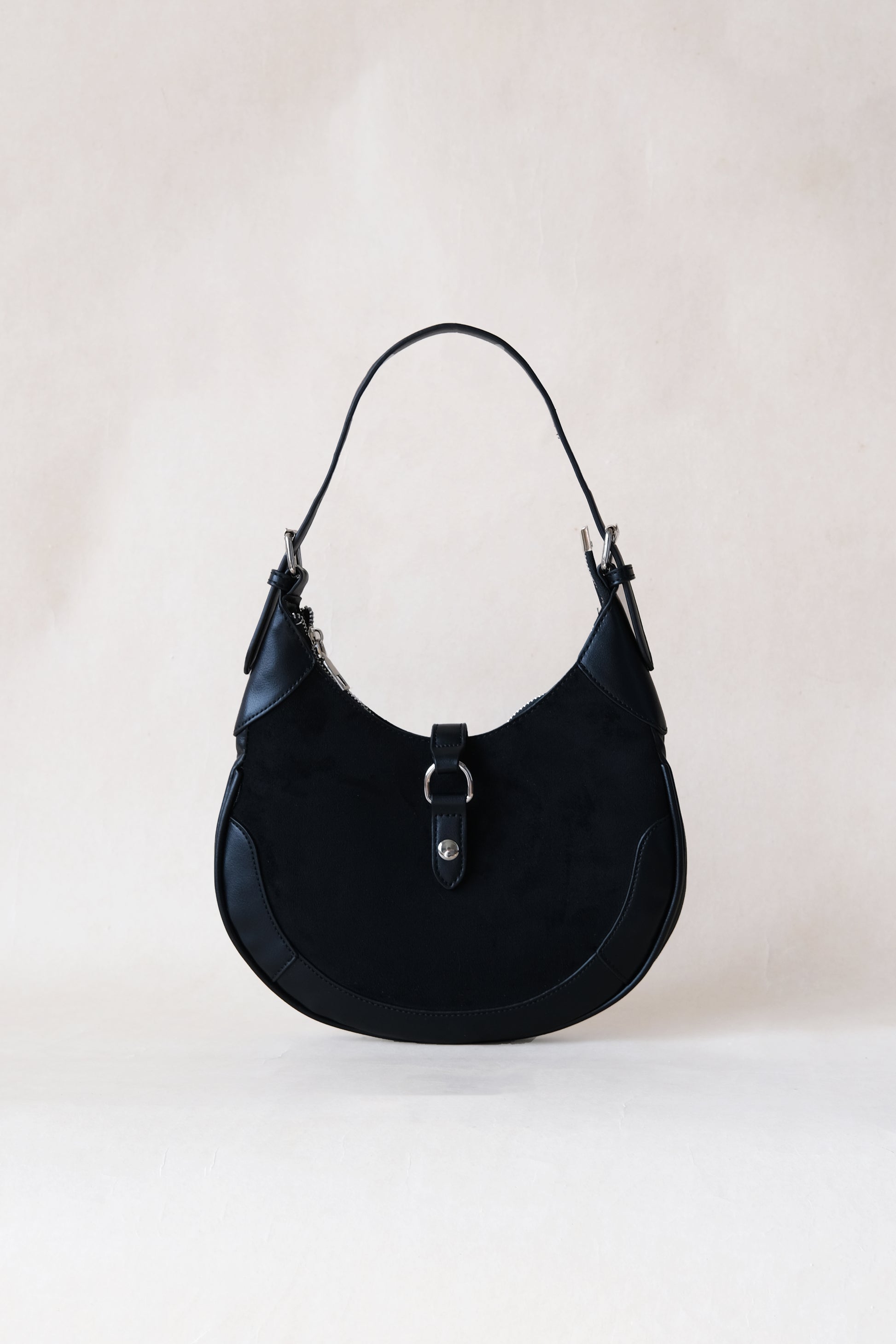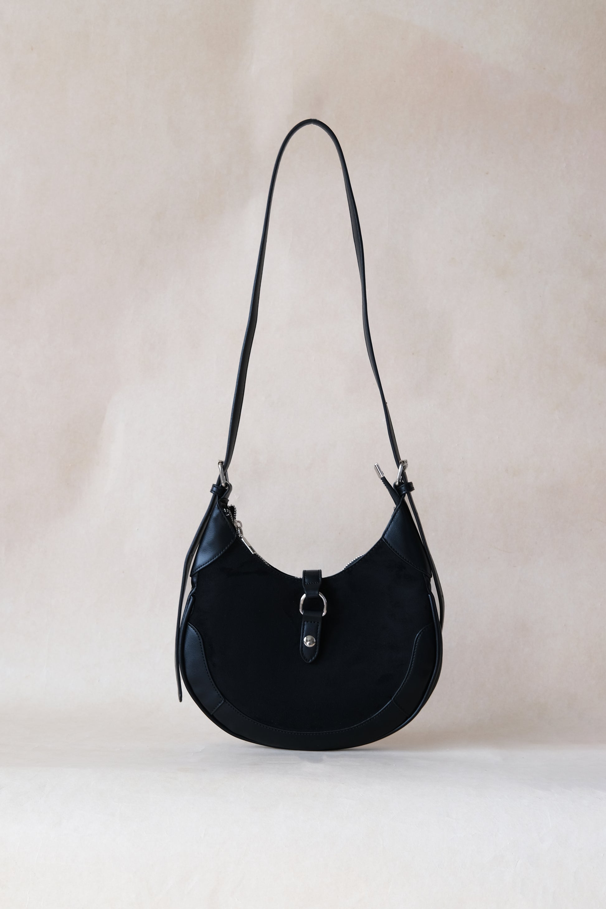 Elevate your look with this elegant saddle handbag crafted from soft, luxurious velvet in timeless black. Its curved silhouette and refined detailing create a sophisticated finish, while the compact interior is perfect for carrying your everyday essentials. A chic blend of classic style and modern charm.