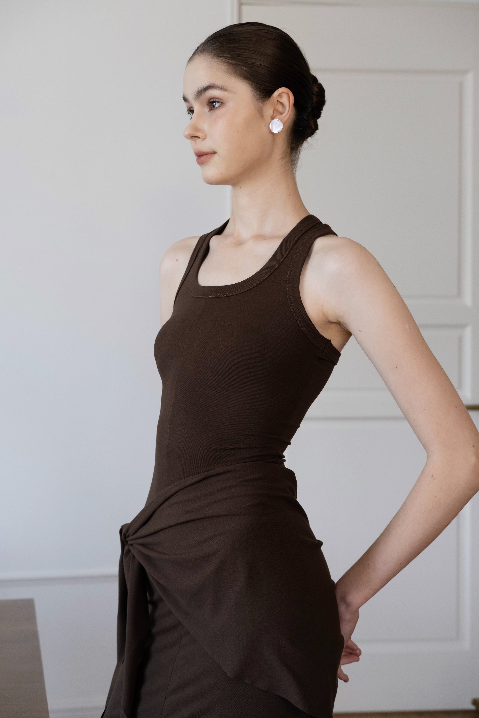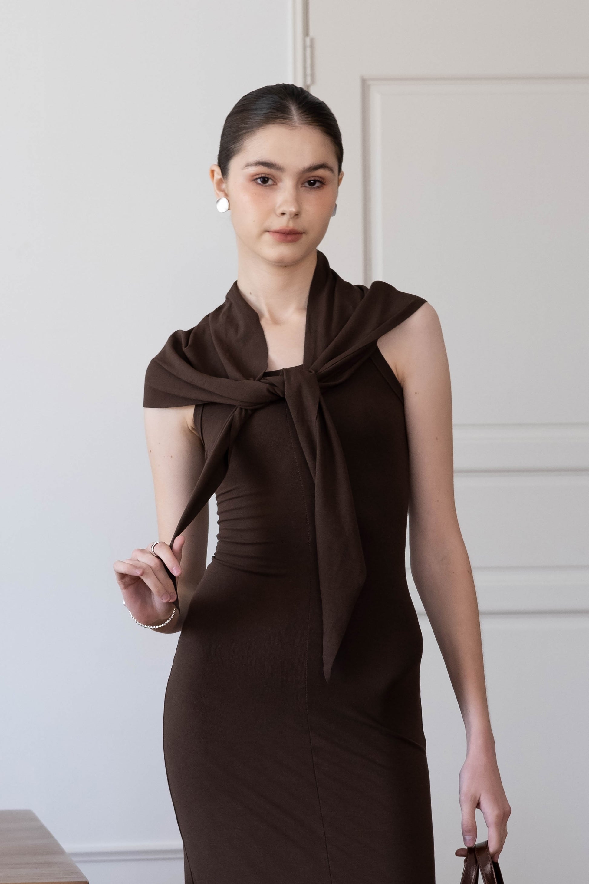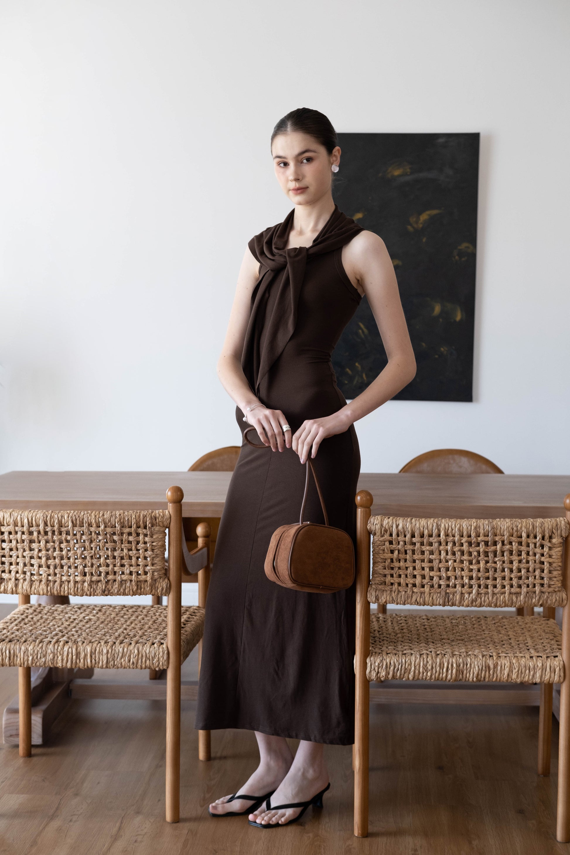 Waist-Snatch U-Neck Maxi Dress - Coffee