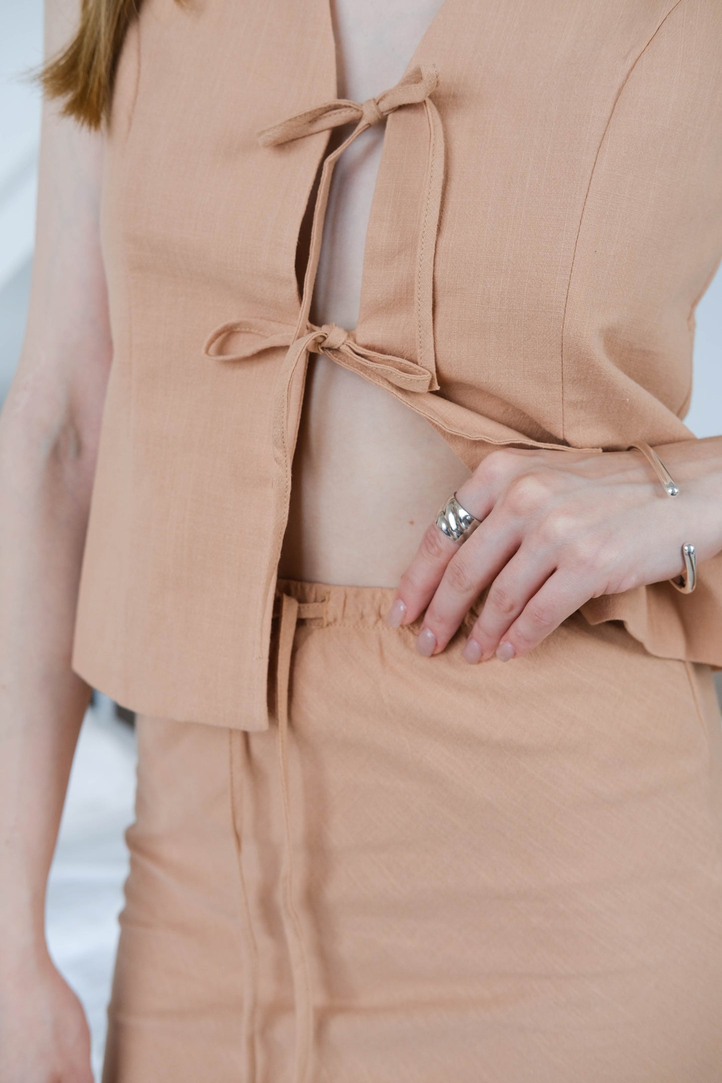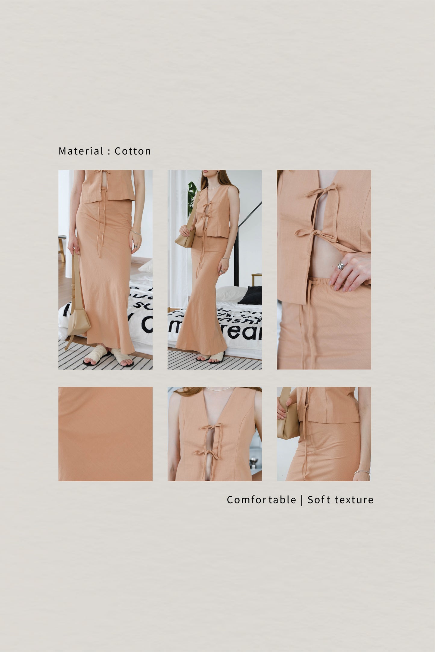 【2件套裝】無袖繫帶背心+長裙-淺卡其色